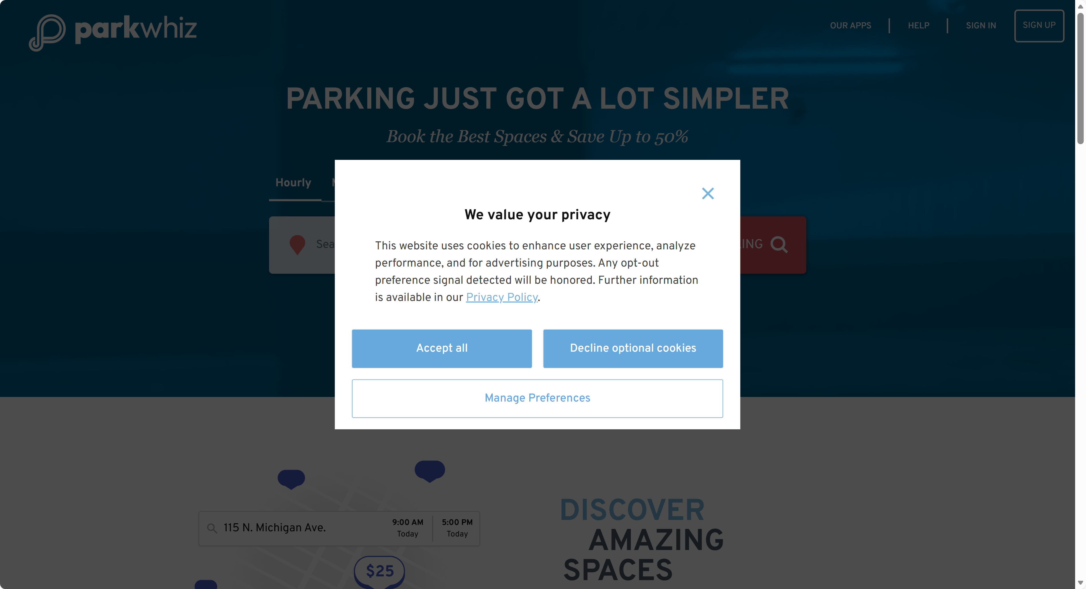Cookie preferences can be managed at any time while interacting with the ParkWhiz website.